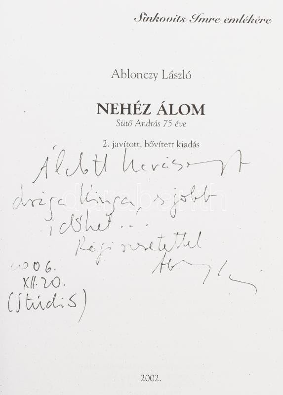 Ablonczy László: Nehéz álom. Sütő András 75 éve. A szerző, Ablonczy László (1945-) József Attila-díjas újságíró, kritikus, színigazgató által Jálics Kinga (1943-2019) kulturális újságíró, szerkesztő részére DEDIKÁLT példány. [Bp.], 2002., Codex Print Kft. 2. kiadás. Fekete-fehér fotókkal illusztrált. Kiadói papírkötés.