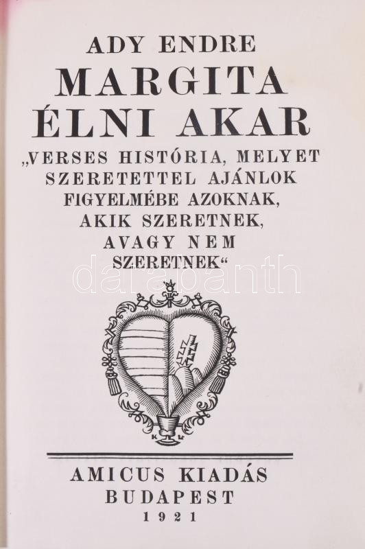 Ady Endre: Margita élni akar. Bp., 1921, Amicus. Kozma Lajos fametszet... https://www.darabanth.com/hu/510-Gyorsarveres/510.0/Konyvek/Konyvek-Egyeb-ritkasagok~785/Ady-Endre-Margita-elni-akar-Bp-1921-Amicus-Kozma-Lajos-fametszeteivel-Egeszvaszon-kotes-~II3455943