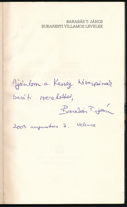 Barabás T. János. Bukaresti villamos levelek. DEDIKÁLT! Sepsiszentgyör... https://www.darabanth.com/hu/510-Gyorsarveres/510.0/Konyvek/Konyvek-Egyeb-ritkasagok~785/Barabas-T-Janos-Bukaresti-villamos-levelek-DEDIKALT-Sepsiszentgyorgy-2003-Medium-Kiadoi-~II3453800