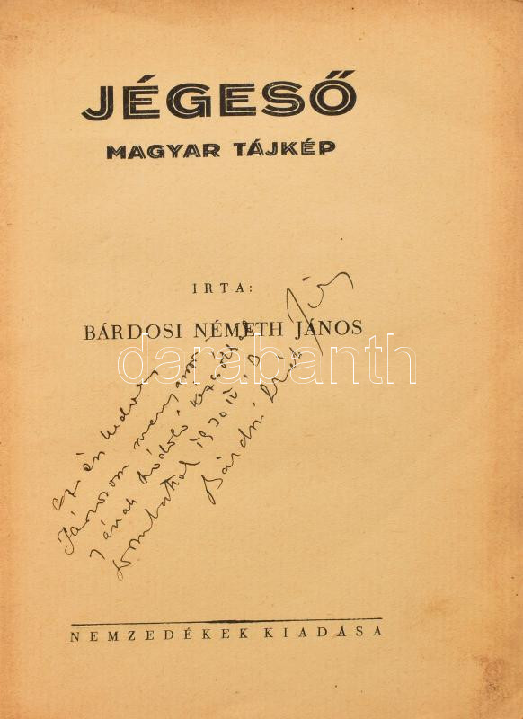 Bárdosi Németh János: Jégeső. Magyar tájkép. A szerző, Bárdosi Németh János (1902-1981) író, költő, szerkesztő által DEDIKÁLT példány. [Pécs], 1930, Nemzedékek, 102+2 p. Kiadói papírkötés, szakadt foltos borítóval.