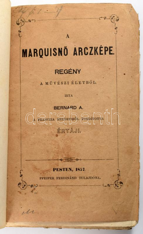 Bernard A.: A marquisnő arczképe. Regény a művészi életből. A francia eredetiből fordította Értáji. Pest, 1857. Pfeifer Ferdinánd. 240p. Kiadói papírborítóval, korabeli laza félvászon kötésben. Ritka!