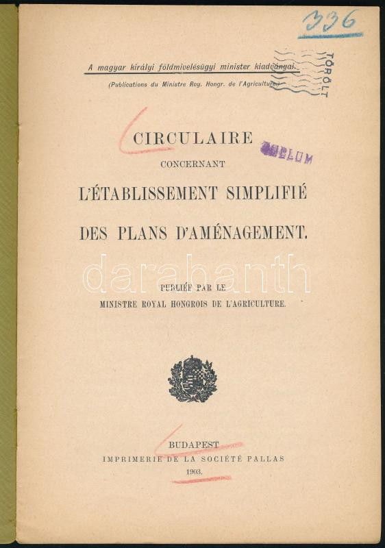 Circulaire concernant L'Établissement simplifié des plans d'aménagement. Publiée Par le Ministre Royal Hongrois De L'Agriculture. A magyar királyi földmivelésügyi minister kiadványai. Bp., 1903. Pallas. Francia nyelvű kiadvány, jelölésekkel. Kiadói tűzött papírkötés, intézményi bélyegzővel.
