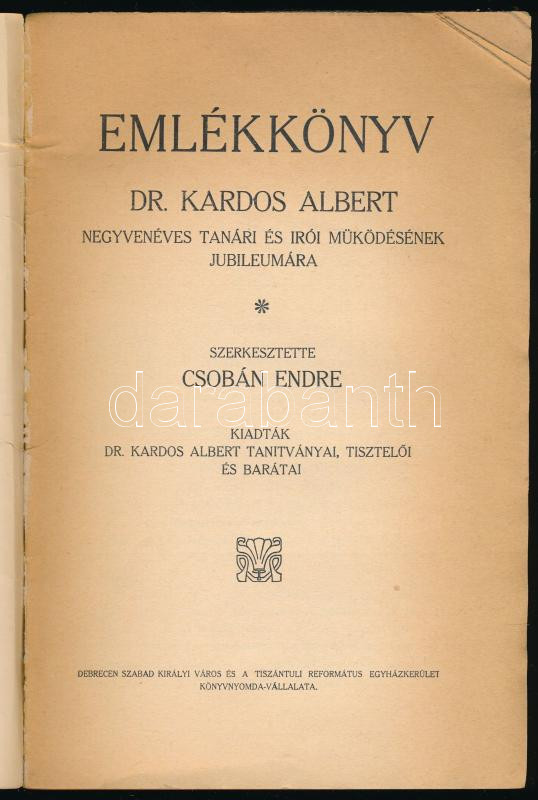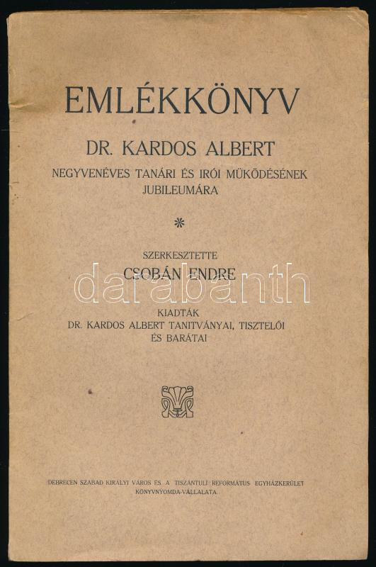 Emlékkönyv Dr. Kardos Albert negyvenéves tanári és írói működésének jubileumára. Szerk.: Csobán Endre. Kiadták Dr. Kardos Albert tanitványai, tisztelői és barátai. Debrecen, [1927], Városi Ny., 104+(2) p. Kiadói papírkötés, kissé sérült, néhány lapon sarokhiánnyal.