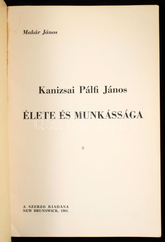 Leírás: Makár János: Kanizsai Pálfi János élete és munkássága. New Brunswick, 1961, Szerző. Kiadói papírkötés, kissé kopottas állapotban.