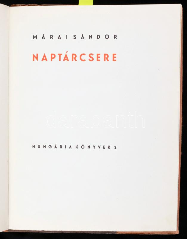 Márai Sándor: Naptárcsere. Szegedi-Szűcs András rajzaival. Hungária Könyvek 2. Bp.,1935, Hungária Nyomda, 25+2 p. Első kiadás. Japán fűzésű lapokkal. Gy. Szabó Béla rajzaival. Kiadói aranyozott kartonált papírkötés, kiadói papír védőborítóban, Kner Erzsébet-kötés, a borítón kis kopásnyomokkal. Számozott, névre szóló példány.