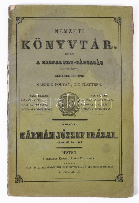 Nemzeti Könyvtár. Első füzet. Kármán József írásai. Pest, Hartleben. K... https://www.darabanth.com/hu/510-Gyorsarveres/510.0/Konyvek/Konyvek-Egyeb-ritkasagok~785/Nemzeti-Konyvtar-Elso-fuzet-Karman-Jozsef-irasai-Pest-Hartleben-Kiadoi-papirkotes-~II3456107