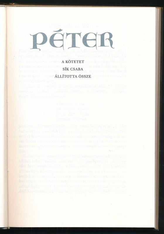 Leírás: Péter. A kötetet Sík Csaba állította össze. Bp., 1990, Helikon. Kiadói plüss kötés, műanyag védőborítóval, jó állapotban.