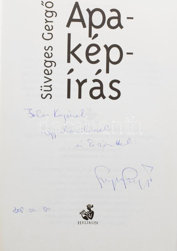 Süveges Gergő: Apa - kép - írás. Szűcs Édua illusztrációival. A szerző, Süveges Gergő (1976- ) újságíró, televíziós műsorvezető által Jálics Kinga (1943-2019) kulturális újságíró, szerkesztő részére DEDIKÁLT példány. [Bp.], 2008, Helikon. Kiadói kartonált papírkötés.