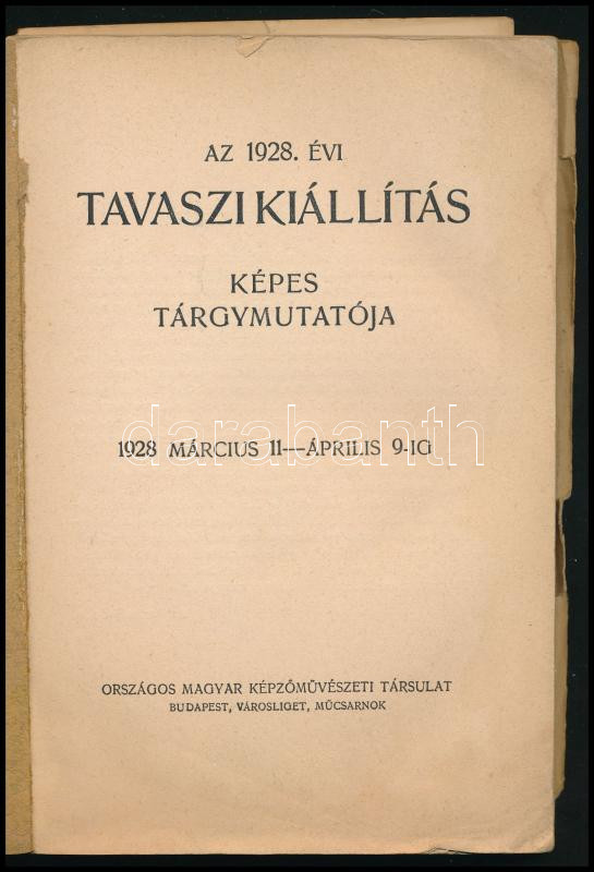 Az 1928. évi tavaszi kiállítás képes tárgymutatója. 1928 március 11 - április 9-ig. Bp., 1928, Orsz. Magy. Képzőművészeti Társulat, 52 p.+ 27 (kétoldalas, fekete-fehér reprodukciók) t. Kiadói papírkötés, sérült borítóval és gerinccel, két sérült, kijáró táblával, 5 tábla hiánnyal.