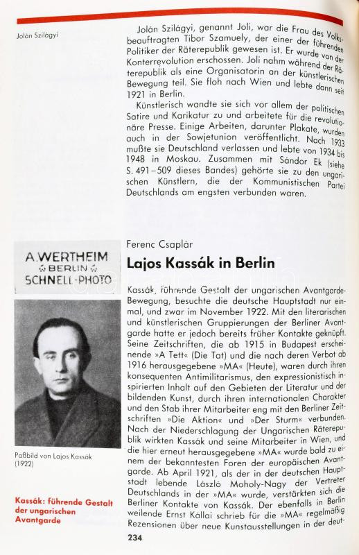 Berliner Begegnungen. Ausländische Künstler in Berlin 1918 - 1933. Aufäze - Bilder - Dokumente. Hrsg. von Klaus Kändler, Helga Karolewski, und Ilse Siebert. Berlin, 1987., Dietz Verlag, 588+1 p. Német nyelven. Fekete-fehér képanyaggal illusztrált. Benne magyar vonatkozású részekkel, ismert magyar művészekkel, Bortnyik Sándor, Czóbel Béla, Kassák Lajos, Kernstock Károly , Mattis-Teutsch János, Kádár Béla, Moholy-Nagy László, Breuer Marcell és mások. Kiadói egészvászon-kötésben, szakadt, javított kiadói papír védőborítóban.