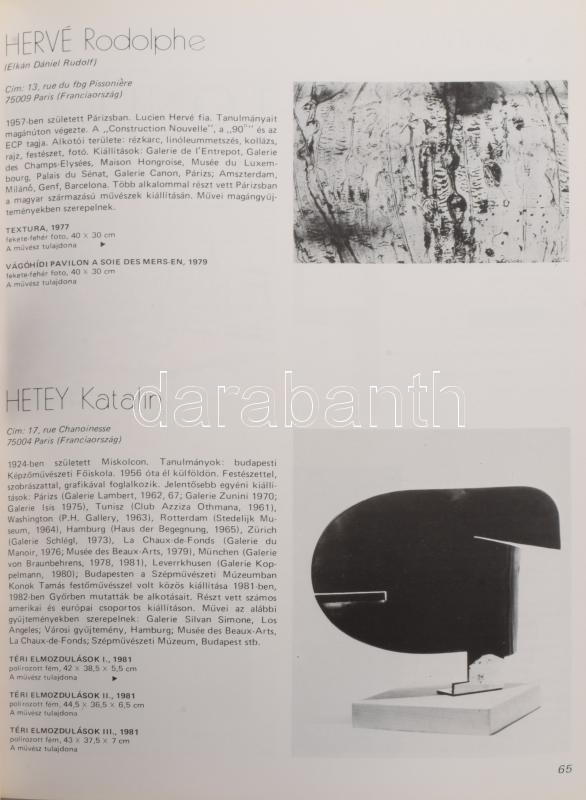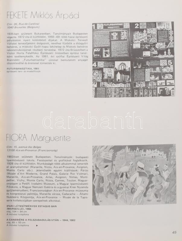 Kortárs művészet múzeumi gyűjteményekben. 1988-1999. Szerk.: Pataki Gábor, Sümegi György. XX. századi magyar művészeti dokumentumok. Bp.,2001., Képző- és Iparművészeti Lektorátus, 267+5 p. Kiadói kartonált papírkötés. + Tisztelet a szülőföldnek. (Hommage a lá terre natale.) Külföldön élő magyar származású művészek II. kiállítása. Szerk.: Baranyi Judit. Bp., 1982, Műcsarnok, 175+1 p. Francia és angol nyelvű bevezetővel, számos illusztrációval. Kiadói papírkötés, sérült kötéssel, kijáró lapokkal.