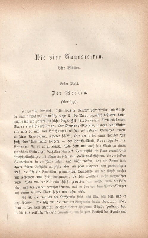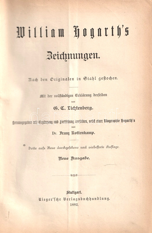 Georg Christoph Lichtenberg (1742-1799) német író, fizikus, az első német aforizmaíró, a német felvilágosodás jeles szerzője, szigetországi angol ifjak nevelőjeként a XVIII. századi londoni élet csípős nyelvű megfigyelője. Kötetében William Hogarth (1694-1764) angol grafikus szatirikus rézkarcait elemzi, rövidebb-hosszabb esszékben. Hogarth Lichtenberghez hasonlóan az angol életmód, az angol hiúság kritikusa, zsúfolt rézmetszetein a XVIII. századi angol élet visszásságainak tart torz tükröt. Kötetünk Hogarth 92 rajzának reprodukcióját közli. Részletes Hogarth-életrajzzal nyitó kötetünk első kiadása 1873-ban jelent meg, példányunk a harmadik, javított kiadásból való. Az utolsó levelek fűzése meggyengült.