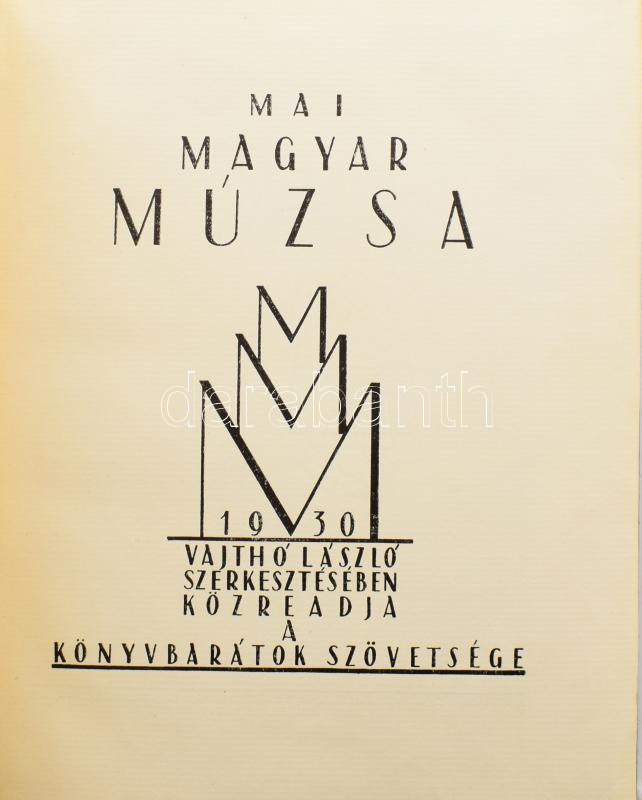 Mai Magyar Múzsa 1930. Szerk.: Vajthó László. Bp., 1930, Könyvbarátok Szövetsége (Kir. M. Egyetemi Ny.), 175 p. Szövegközi illusztrációkkal, Horváth Jenő, Pérely Imre és Gehl Zoltán rajzaival. Benne 3 db korabeli prospektussal is. Kiadói aranyozott, dombornyomott félbőr-kötés, kopott borítóval, sérült gerinccel.