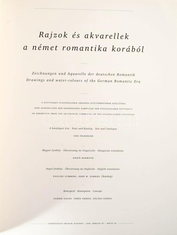 "Mély erdők ölén álmodtam én". Rajzok és akvarellek a német romantika korából a stuttgarti Staatsgalerie Grafikai Gyűjteményéből. Bp., 2002, Szépművészeti Múzeum, VII+1+184 p. Gazdag képanyaggal illusztrálva. Kiadói papírkötés.