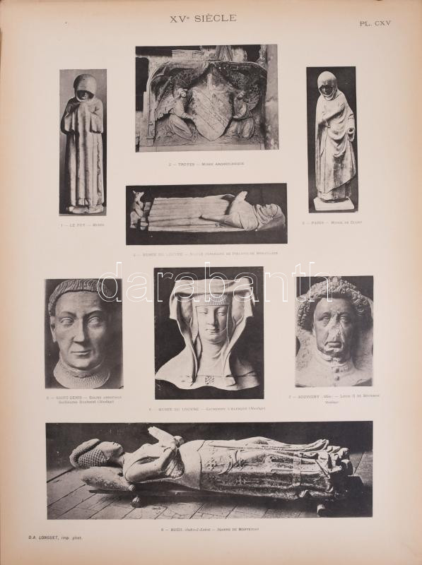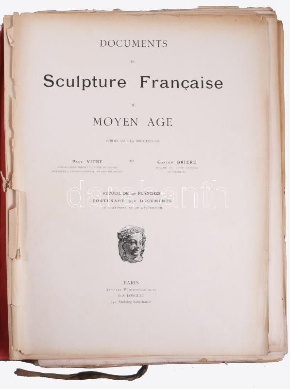 Paul Vitry - Gaston Briére: Documents de sculpture française du Moyen-Age. Paris,én,Ateliers Photomechaniques D.-A. Longuet. Gazdag képanyaggal, nagyrészt fekete-fehér, kisebb részben színes táblákkal illusztrált. Korabeli félvászon-mappa, átnézésre, rendezésre szorul, feltehetőleg hiányos, kopott, foltos borítóval, sérült gerinccel, 41x31x3,5 cm