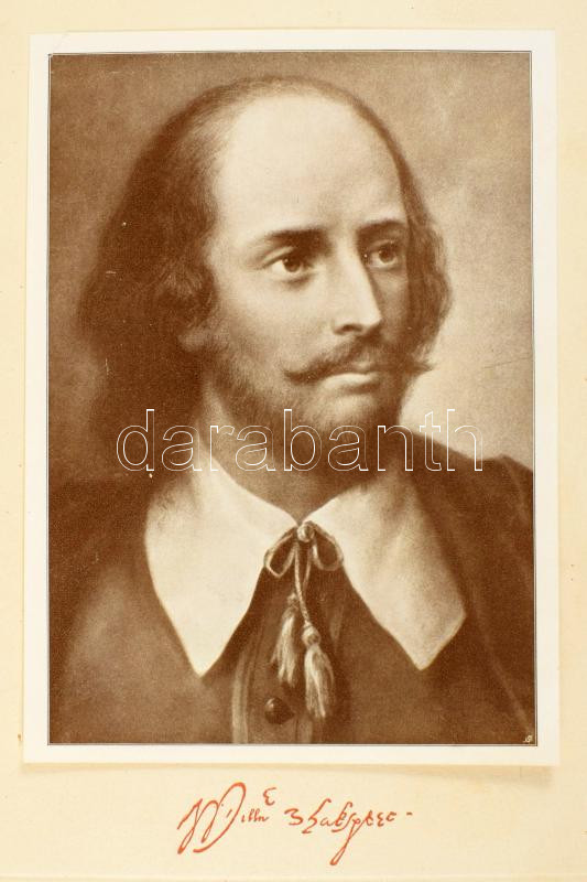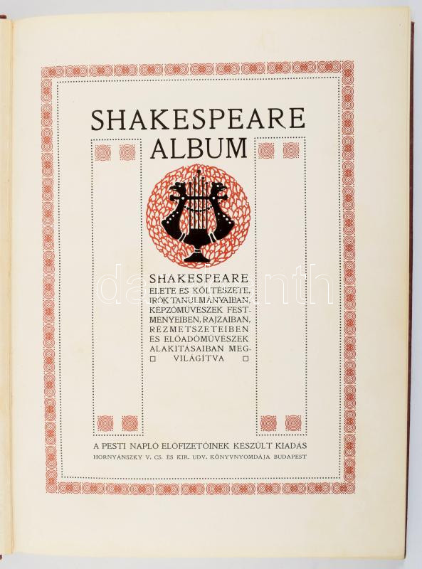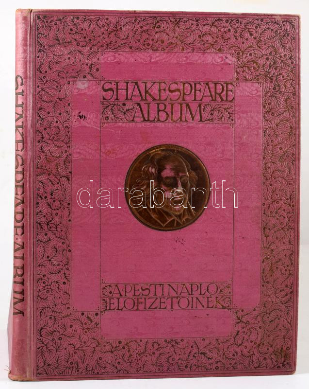 Shakespeare album. Shakespeare élete és költészete, írók tanulmányaiban, képzőművészek festményeiben, rajzaiban, rézmetszeteiben és előadóművészek alakításaiban megvilágítva. A Pesti Napló előfizetőinek készült kiadás. [Bp., 1910], Hornyánszky-ny., 1 (címkép) t.+ 132 p.+ 12 (színes, feliratozott hártyapapírral) t. Kiadói aranyozott, dombornyomott Shakespeare-portréval díszített egészvászon-kötés, a borítón kisebb foltokkal.
