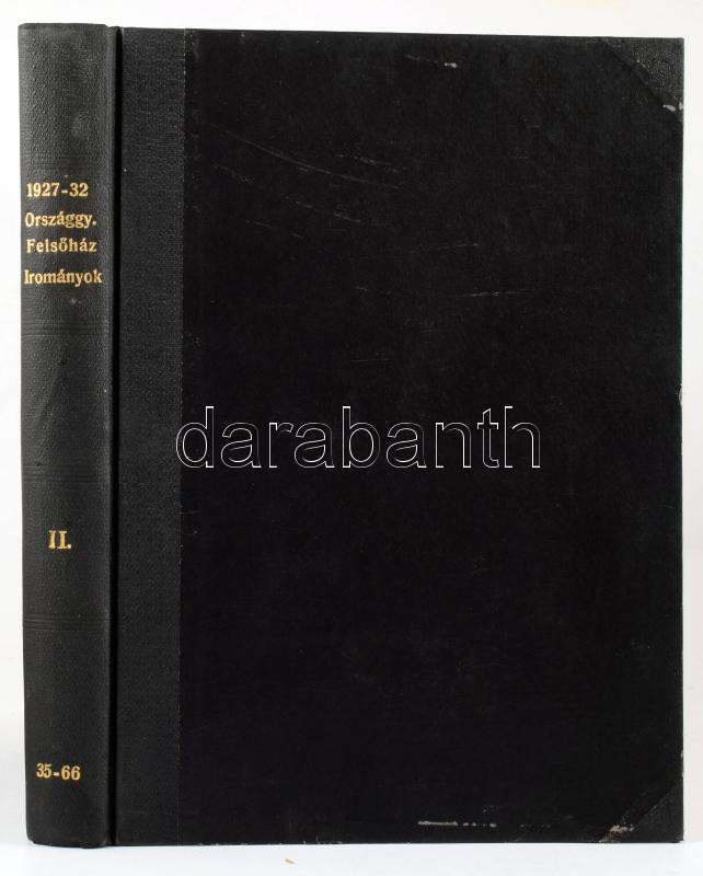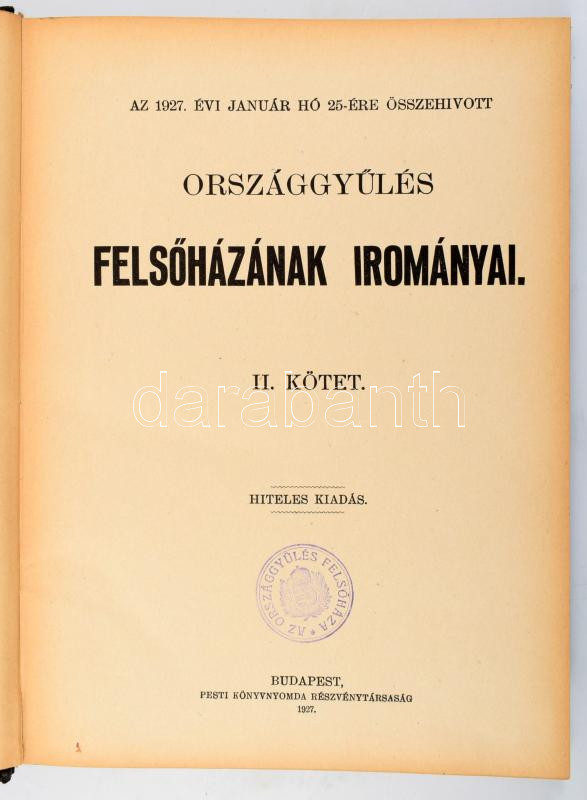 Az 1927. évi január hó 25-ére összehivott Országgyűlés Felsőházának irományai. II. kötet. Bp., 1927, Pesti Könyvnyomda Rt., VIII+566 p. Aranyozott gerincű félvászon-kötésben, kissé viseltes borítóval, "Az Országgyűlés Felsőháza" bélyegzővel.