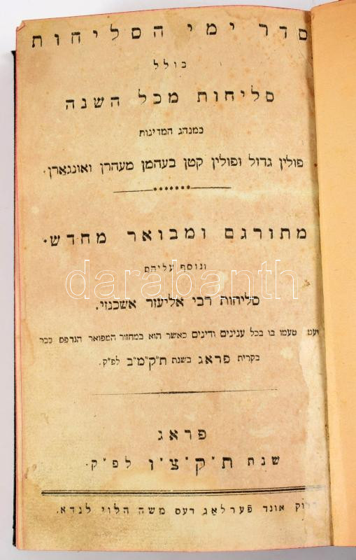 Régi izr. vallási könyv. Benne 1905-ös bejegyzéssel (Stein Jakab) + 1951 belépőjegy. Kiadói félbőr kötés, színezett lapszélek, kissé kopottas állapotban.