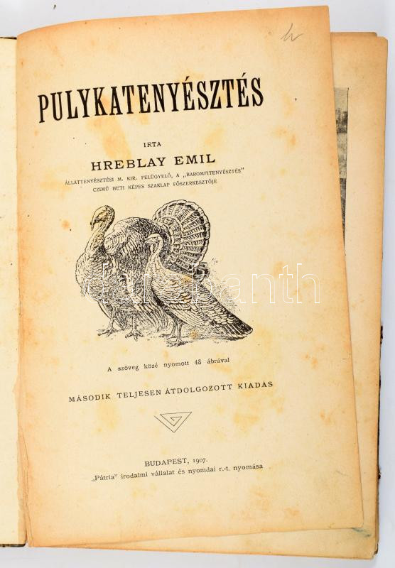 Hreblay Emil: Pulykatenyésztés. Budapest, 1907, Pátria Irodalmi Vállalat és Nyomdai R.T. Második teljesen átdolgozott kiadás. 123+20 p. Számos szövegközti ábrával illusztrálva. Kopottas félvászon kötés, fűzésnél szétvált. Ritka