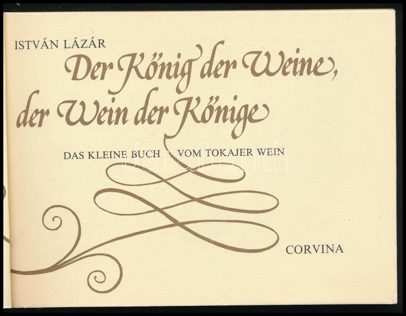 Lázár, István: Der König der Weine, der Wein der Könige. Das kleine Buch vom Tokajer Wein. Zeichnungen von Lívia Elek. Mit Rezepten von Túrós Elek. [Bp.], 1987, Corvina, 121+1 p. Német nyelven. Kiadói papírkötés.