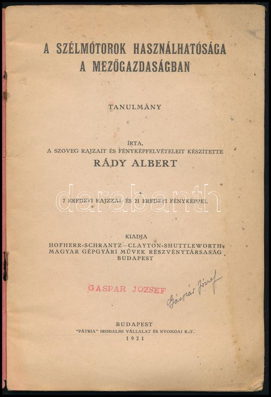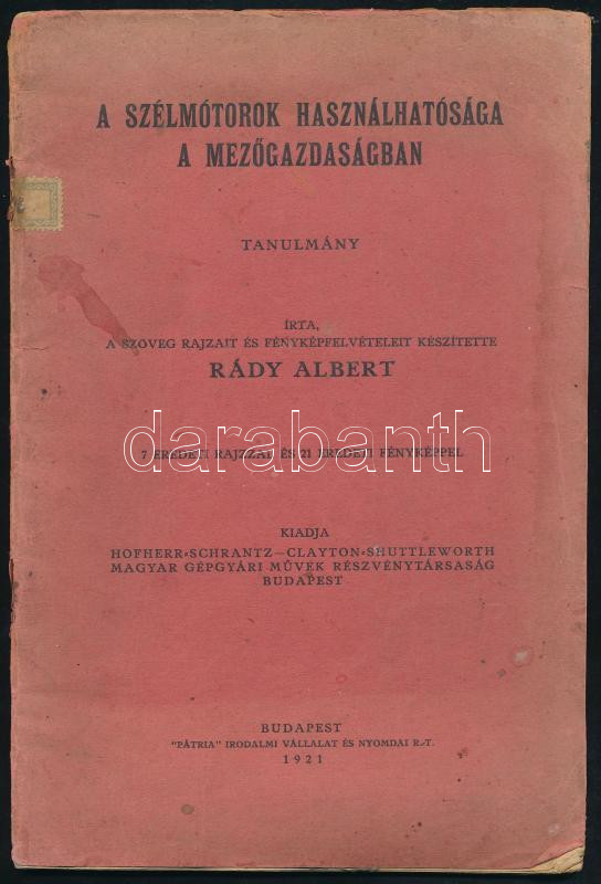Rády Albert: A szélmótorok használhatósága a mezőgazdaságban. Tanulmány. Írta, a szöveg rajzait és fényképfelvételeit készítette: - - . Bp., 1921, Hofherr-Schrantz-Clayton-Shuttleworth Magyar Gépgyári Művek Rt. ("Pátria"-ny.), 47+(9) p. Fekete-fehér képekkel, ábrákkal illusztrálva. Kiadói tűzött papírkötés. Ritka!