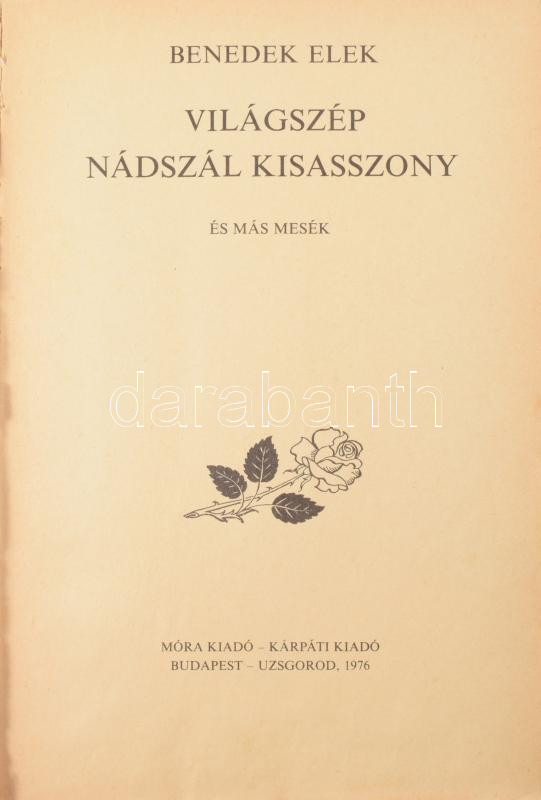 2 db Benedek Elek mesekönyv: Világszép nádszál kisasszony és más mesék. [Kaeszné] Lukáts Kató rajzaival. Bp.-Uzsgorod, 1976, Móra - Kárpáti Kiadó. Kiadói illusztrált félvászon-kötés, viseltes borÃtóval, helyenként kissé foltos lapokkal. + A vitéz szabólegény. Szecskó Tamás rajzaival. Bp., 1979, Móra. Kiadói egészvászon-kötés, kissé foltos borÃtóval.
