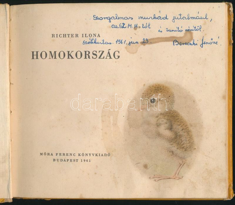 Leírás: Richter Ilona: Homokország. Bp., 1961, Móra. Kiadói félvászon-kötés, kissé viseltes, sérült borítóval, foltos, ajándékozási bejegyzéssel.