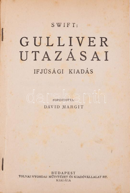 Swift, [Jonathan]: Gulliver utazásai. Ifjúsági kiadás. Ford.: Dávid Ma... https://www.darabanth.com/hu/510-Gyorsarveres/510.0/Konyvek/Konyvek-Mesekonyvek-ifjusagi-irodalom~783/Swift-Jonathan-Gulliver-utazasai-Ifjusagi-kiadas-Ford-David-Margit-Bp-1937-Tolnai~II3456016