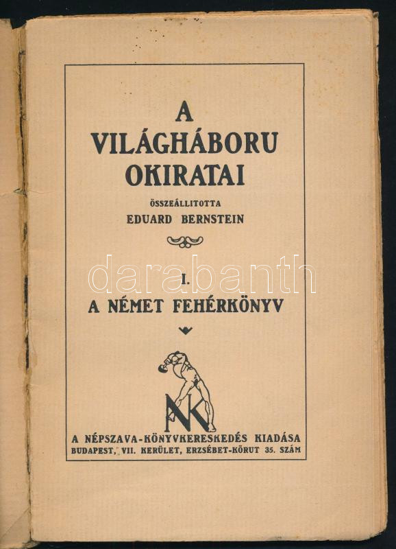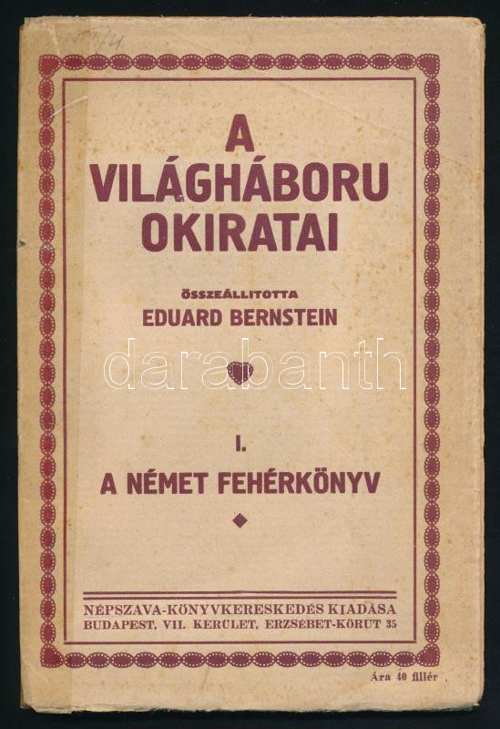A világháború okiratai. Összeáll.: Eduard Bernstein. I.: A német fehérkönyv. Bp., [1915], Népszava (Világosság-ny.), 56 p. Kiadói papírkötés, kissé foltos borítóval, sérült, ragasztott gerinccel, szétvált fűzéssel, a lapok többsége kijár.