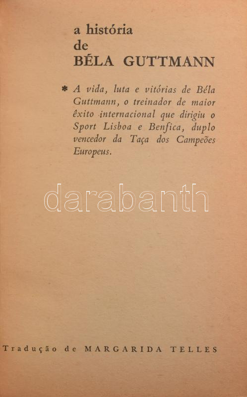 Jenö Csaknady: A história de Béla Guttmann. Livraria Bertrand, Lisszabon, 1964, 295 p., egészvászon kötésben, jó állapotban, portugál nyelven (Gutmann Béla 1899-1981) magyar labdarúgó nemzetközileg jegyzett edző, a Benfica és Porto vezetője.
