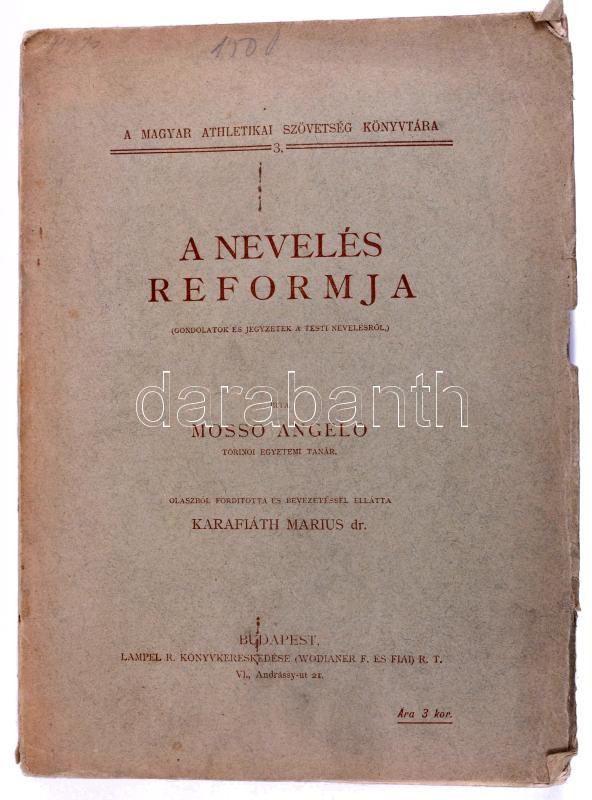 Mosso Angelo: A nevelés reformja (Gondolatok és jegyzetek a testi nevelésről.) Ford.: Karafiáth Márius. A Magyar Athletikai Szövetség Könyvtára 3. Bp., 1911., Lampel Róbert (Wodianer F. és Fiai) Rt., VIII+151 p. Kiadói papírkötés, a borítón és a gerincen kis sérülésekkel.