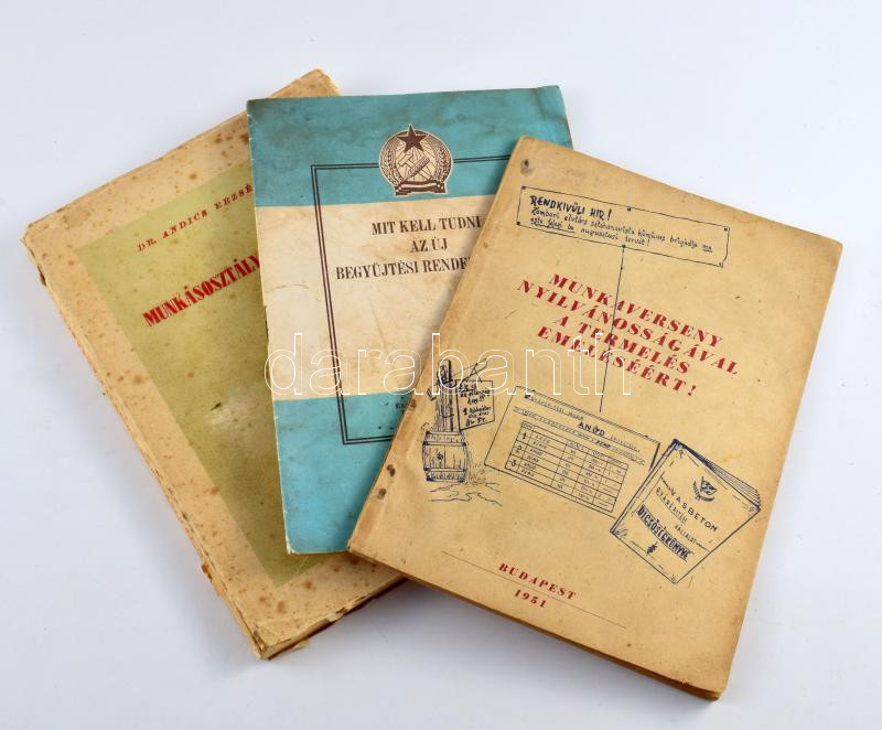 Andics Erzsébet: Munkásosztály és nemzet. Bp., 1945, Szikra, 111+(1) p. Első kiadás. Kiadói papírkötés, viseltes, foltos borítóval, helyenként foltos lapokkal. + 2 db szocialista kiadvány: Munkaverseny nyilvánosságával a termelés emeléséért! A szocialista munkaverseny ellenőrzésének tapasztalatai és feladatai.; Mit kell tudni az új begyűjtési rendszerről? Változó állapotban, az egyiken ázásnyomokkal.