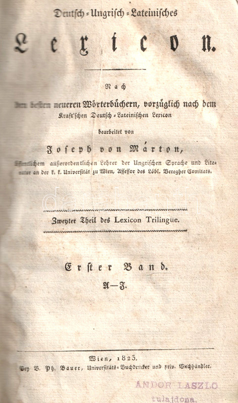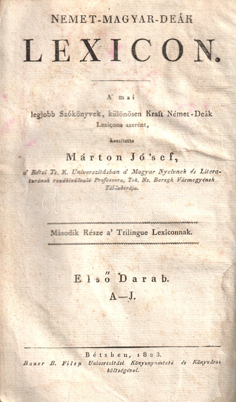 Német-magyar-deák Lexicon. A' mai legjobb Szókönyvek, különösen Kraft Német-Deák Lexicona szerént, készítette Márton Jó'sef. Első Darab: A-J.