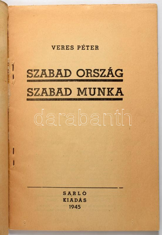 Leírás: Veres Péter: Szabad ország, szabad munka. [Bp.], 1945, Sarló, 47 p. Kiadói papírkötés, minimálisan sérült borítóval.