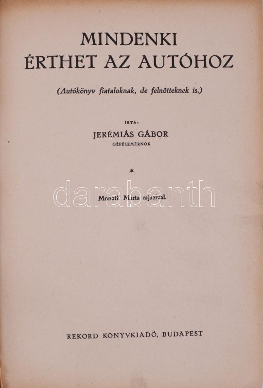 Jeremiás Gábor: Mindenki érthet az autóhoz. (Autókönyv fiataloknak, de felnőtteknek is.) Monath Márta rajzaival. Bp., [1937], Rekord, 205+(3) p. Egyetlen kiadás. Átkötött félvászon-kötésben, nagyrészt jó állapotban, ex libris-szel.