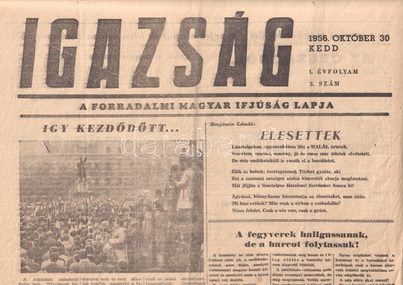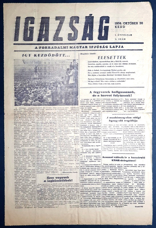 [Folyóirat, 1956.] Igazság. A Forradalmi Magyar Ifjúság lapja. Felelős szerkesztő: Obersovszky Gyula. I. évfolyam, 3. szám. (1956. október 30.)