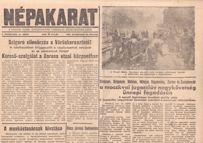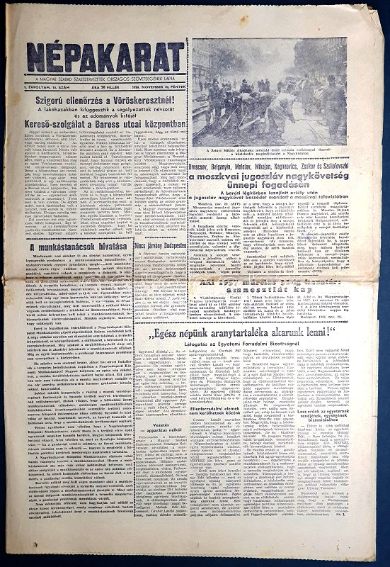 Az 1956-os forradalom napjaiban létrejött szakszervezeti lap, a Népakarat egészen 1958-ig létezett. Feltehetően szerkesztőségi hatalomátvétel után megjelent lapszámunk írásai kettős természetűek. A név nélkül megjelent írások elismerik a forradalom eredményeit, méltatják a munkástanácsok munkáját, ám a kötelező körökön kívül a Kádár-hitű nyilatkozóknak biztosít megszólalási lehetőséget. E megnyilvánulások elítélik az ellenforradalmár törekvéseket, hírt adnak arról, hogy fizetési prémiumban azok a gyári munkások részesülnek, akik a munkát 1956 októberében és novemberében nem függesztették fel [azaz nem csatlakoztak a forradalomhoz]. Oldalszámozáson belül néhány fényképpel.
