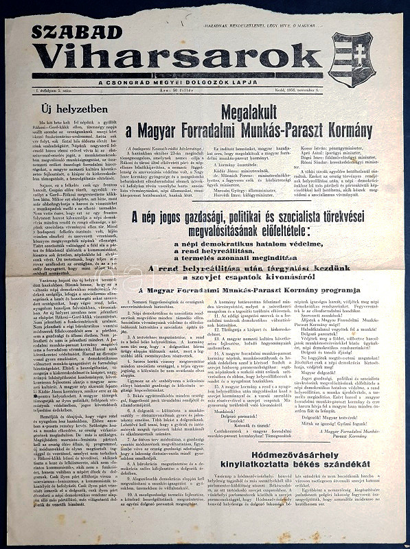 [Folyóirat, 1956.] Szabad Viharsarok. A Csongrád megyei dolgozók lapja. I. évfolyam, 5. szám. (1956. november 6.) [Megalakult a Magyar Forradalmi Munkás-Paraszt Kormány. A Magyar Forradalmi Munkás-Paraszt Kormány programja. A magyarországi szovjet csapatok parancsnokságának nyílt levele.]