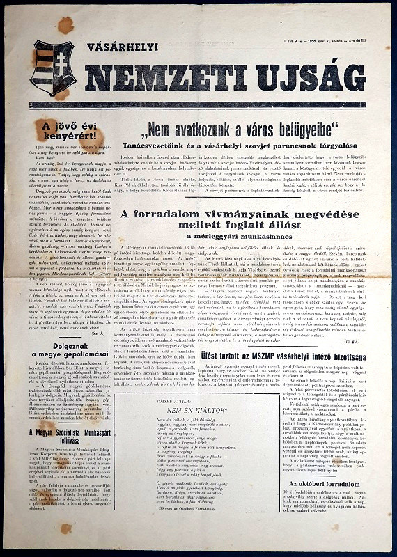 [Folyóirat, 1956.] Vásárhelyi Nemzeti Újság. A Hódmezővásárhelyi Nemzeti Bizottság napilapja. Felelős szerkesztő: Moldvay Győző. I. évfolyam, 9. szám. (1956. november 7.) [A Magyar Szocialista Munkáspárt felhívása. Szovjet segély Magyarországnak. Nehogy a ló másik oldalára essünk. A mohóságról.]
