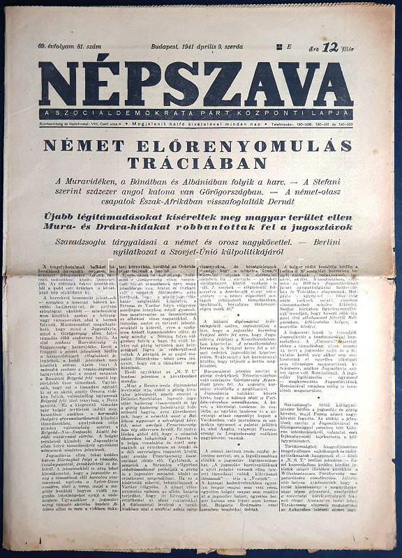 [Folyóirat] Népszava. A Szociáldemokrata Párt központi lapja. Főszerkesztő: Szakasits Árpád. 69. évfolyam, 81. szám. (1941. április 9.) [Mura- és Dráva-hidakat robbantottak fel a jugoszlávok.]