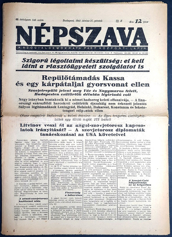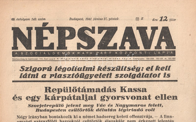 [Folyóirat] Népszava. A Szociáldemokrata Párt központi lapja. Főszerkesztő: Szakasits Árpád. 69. évfolyam, 143. szám. (1941. június 27.) [Repülőtámadás Kassa ellen.]