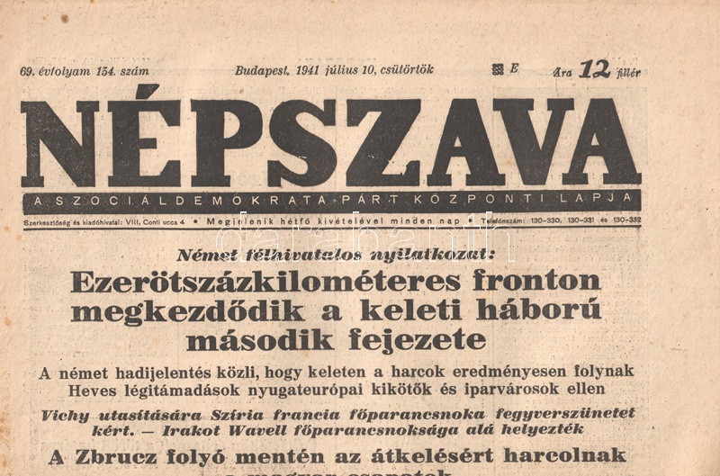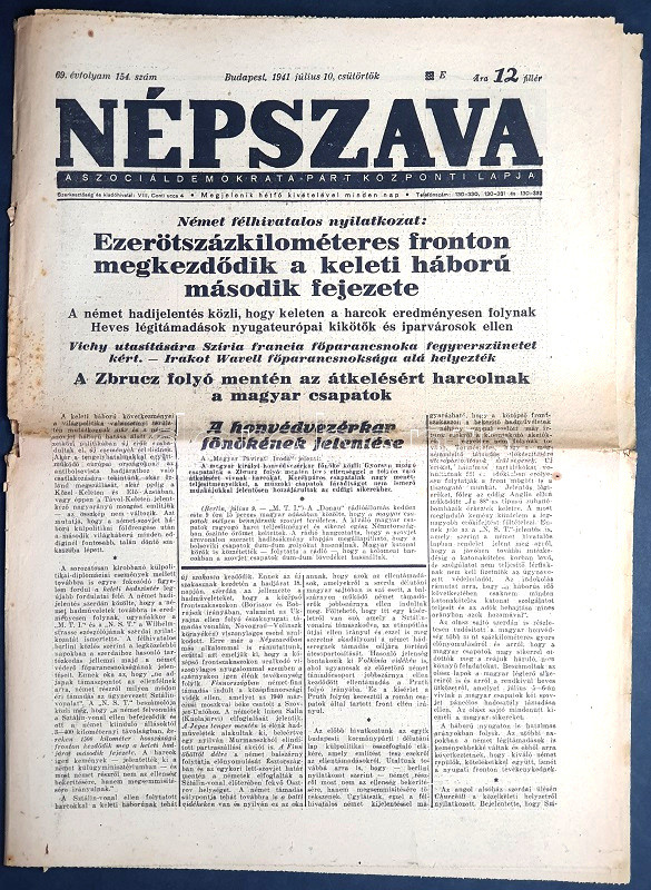 [Folyóirat] Népszava. A Szociáldemokrata Párt központi lapja. Főszerkesztő: Szakasits Árpád. 69. évfolyam, 154. szám. (1941. július 10.) [A Zburucz folyó mentén az átkelésért harcolnak a magyar csapatok.]