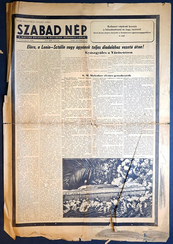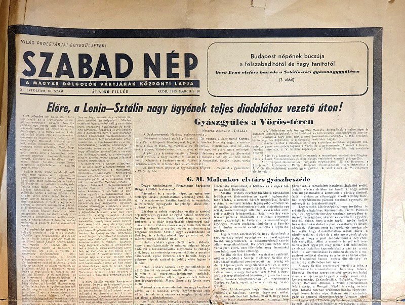 Joszif Visszarionovics Sztálin (1878-1953), a Szovjetunió Minisztertanácsának elnöke, a generalisszimusz 1953. március 5-én elhunyt. Halálhírét másnap különkiadásban tette közzé a Szabad Nép, a Magyar Dolgozók Pártjának központi lapja. Felvételekkel illusztrált lapszámunk a márciusi 9-i moszkvai gyászszertartással foglalkozik, közli a beszédeket, Berija és Molotov elvtárs beszédét, valamint név szerint felsorolja, hogy mely kormányküldöttségek vettek részt a halotti meneten. A magyar küldöttséget Rákosi Mátyás vezette, a legmagasabb szinten képviselték államukat a szovjet blokk országai is, mellettük Finnország államfője jelent meg. Nagy-Britanniából a moszkvai követet kérték fel, az Amerikai Egyesült Államok nem vett részt a megemlékezésen. Erről a lap nem ejt szót, helyette a budapesti Sztálin-téren tartott gyászszertartástól olvashatni, az eseményen Gerő Ernő elvtárs vázolta a veszteség mértékét. A továbbiakban különféle gyárak részvét-táviratai, illetve költemény a halott tiszteletére. A magyar mozik Sztálin életét bemutató filmeket vetítettek. [Berija elvtárs nekrológjának különös pikantériát ad az a korszakban is elterjedt szóbeszéd, miszerint maga Berija mérgezte meg Sztálint; ennek valóságtartalma máig találgatások tárgya, ám a módszer a szovjet hatalomgyakorlás világától nem idegen.]