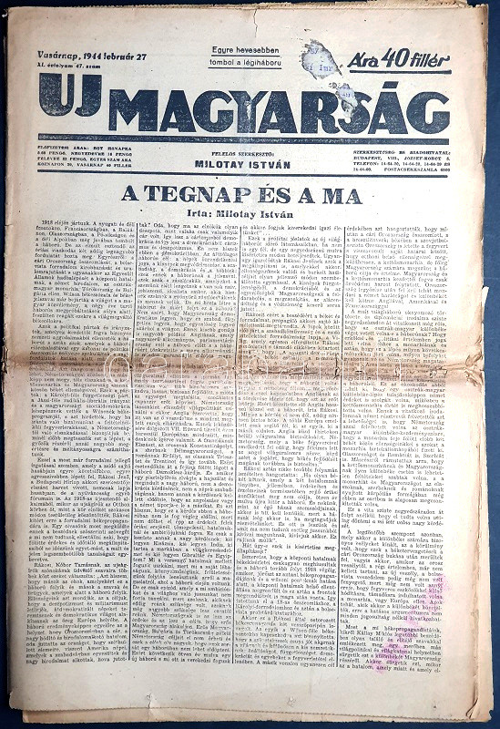[Folyóirat] Új Magyarság. Politikai napilap. Felelős szerkesztő: Milotay István. XI. évfolyam, 47. szám. (1944. február 27.) [A bolsevisták több erős támadása ismét véresen összeomlott.]