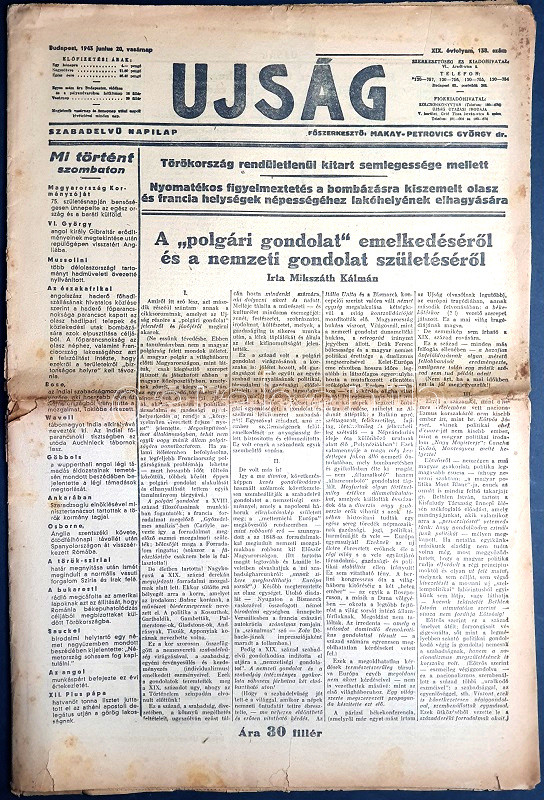 A lap "Ujság" néven indult újra. Lapunk az 1940-es években is megőrizte klasszikus nemzeti szabadelvű irányvonalát, ennek megfelelően a nyilas sajtó egyik céltáblájává vált, a szélsőjobb orgánumok rendre angolbarátsággal és lelketlen kozmopolitizmussal vádolták meg. Lapszámunk a Berlinből érkező nyilatkozatokat és háborús kommünikéket mindenféle kommentár nélkül teszi közzé; az egymás mellé tett kijelentések pedig túlzó hangvételük révén egymást kioltó hatást keltenek. A háború folyásának értékelésétől eltekint, ám igencsak beszédes a terjedelem, amelyet az itáliai helyzetnek szentel. 1943 nyarának két jelentős, és a háború kimenetelét alaposan befolyásoló eseménye a kurszki páncéloscsata, illetve a szicíliai partraszállás, ez utóbbinak napokon belüli bekövetkezéséről sokat sejtető hírösszeállítást ad közre (a partraszállásra egy hónap múlva valóban sor került). Lapszámunk tárcáit Kovács György, Földi Mihály és Takáts Sándor írta, vezércikke pedig Mikszáth Kálmán egy posztumusz, ám a jelen helyzetre rímelő publicisztikája.