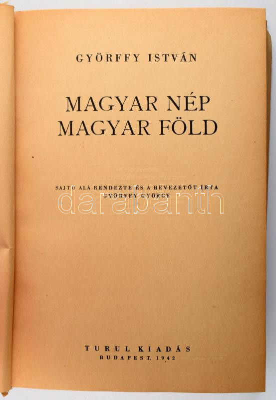 Győrffy István: Magyar nép, magyar föld. Sajtó alá rendezte és a bevezetőt írta Györffy György. Budapest, 1942. Turul. [Jövő ny.] 477 + [2] p. + I-XXIV. számozott képtábla + 2 térképvázlat + I-XI. számozott, különálló melléklet + 1 lev. mellékletjegyzék. Szövegközti ábrákkal. Kiadói félvászon kötésben, a kötéstáblánál részben elvált.