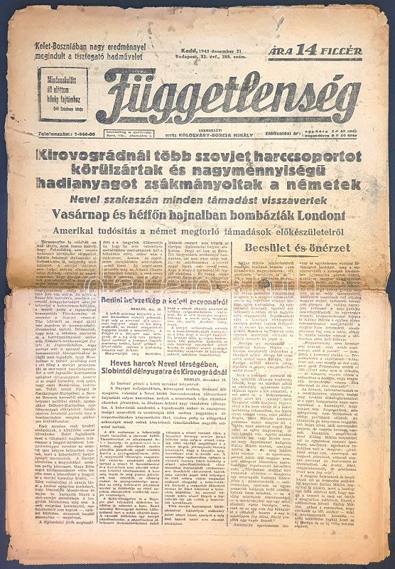[II. Világháború] Függetlenség. Szerkeszti vitéz Kolosváry-Borcsa Mihály. 1943. december 21. (Napilap, XI. évfolyam, 288. szám) "Kirovográdnál több szovjet harccsoportot körülzártak és nagymennyiségű hadianyagot zsákmányoltak a németek -- Nevel szakaszán minden támadást visszavertek -- Vasárnap és hétfőn hajnalban bombázták Londont" Félbehajtva, jó állapotban.