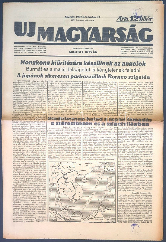 [II. Világháború] Uj Magyarság. Felelős szerkesztő: Milotay István. 1941. december 17. (Napilap, VIII. évfolyam, 287. szám) "Hongkong kiürítésére készülnek az angolok -- Burmát és a maláji félszigetet is kénytelenek feladni -- A japánok sikeresen partraszálltak Borneo szigetén" Félbehajtva, jó állapotban.