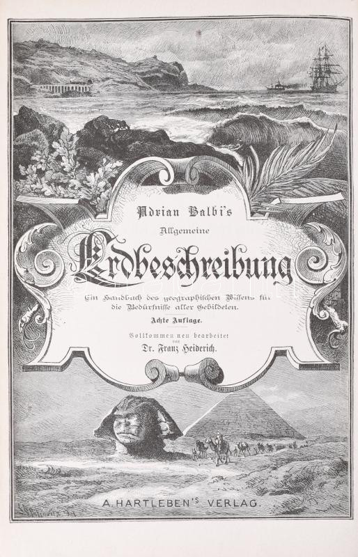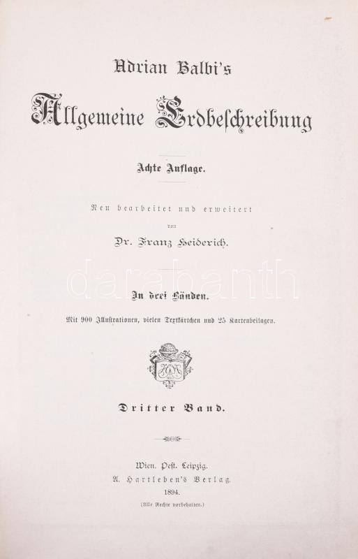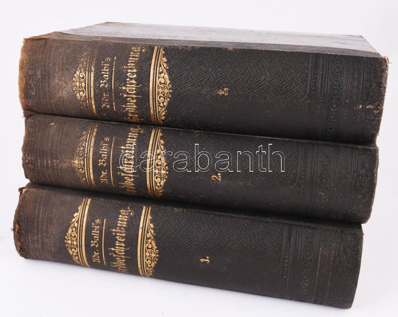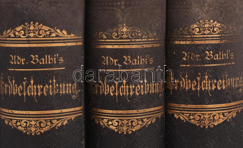 [Balbi, Adriano (1872-1848)] Adrian Balbi's Allgemeine Erdbeschreibung. Neu bearbeitet und erweitert von Franz Heiderich. I-III. köt. Wien-Pest-Leipzig, 1893-1894, A. Hartleben. Szövegközti és egészoldalas, fekete-fehér képekkel, ill. kihajtható, színes térképekkel. Német nyelven. Aranyozott gerincű félvászon-kötésben, változó állapotban.