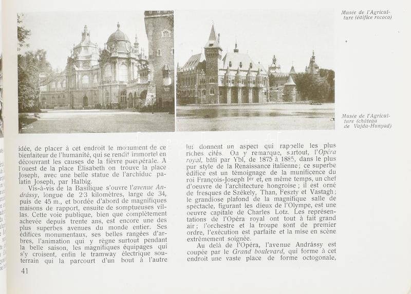 Budapest et environs avec la Hongrie. Description illustrée. Bp., é.n. (cca 1910), Hornyánszky-ny., 128 p. Gazdag fekete-fehér képanyaggal illusztrálva. Francia nyelven. Kiadói harántalakú papírkötés, az elülső borító belsején javítással, szakadt borítóval.